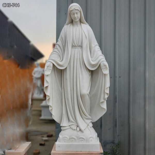 This marble Madonna statue is carved from A-grade natural marble, and the white marble makes the whole statue look more sacred. Mary has a classic movement, with her arms outstretched, as if she is blessing every praying Catholic. A snake is carved at the feet of the Virgin, which is also a classic design. The snake under the feet of the Virgin Mary symbolizes evil and sin, while the Virgin Mary represents goodness, purity, and holiness.
