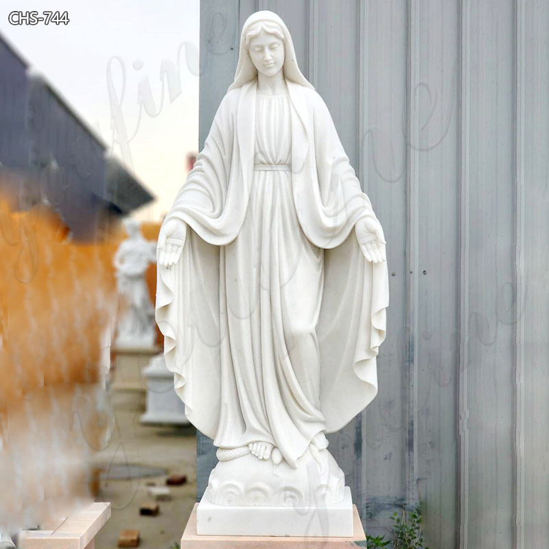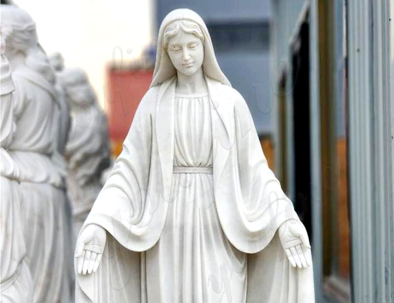 This marble Madonna statue is carved from A-grade natural marble, and the white marble makes the whole statue look more sacred. Mary has a classic movement, with her arms outstretched, as if she is blessing every praying Catholic. A snake is carved at the feet of the Virgin, which is also a classic design. The snake under the feet of the Virgin Mary symbolizes evil and sin, while the Virgin Mary represents goodness, purity, and holiness.