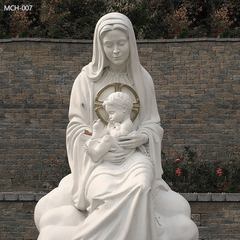The mother Mary marble statue depicts the Virgin Mary holding the infant Jesus Christ in her arms.